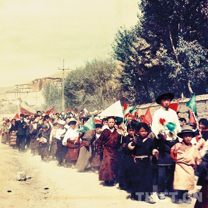 圖為藍(lán)志貴于1959年拍攝的《國慶十周年藏族兒童在布達(dá)拉宮腳下慶祝游行》 圖片由中國美術(shù)館提供