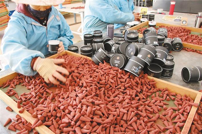 圖為慈成藏香廠的工作人員將成型的藏香裝入盒中。記者 王雨霏 王雅慧 攝