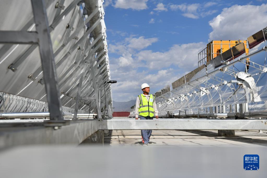 中建一局工作人員檢查高散輻射主動(dòng)式太陽(yáng)能供暖設(shè)備(7月6日攝)。新華社記者 晉美多吉 攝
