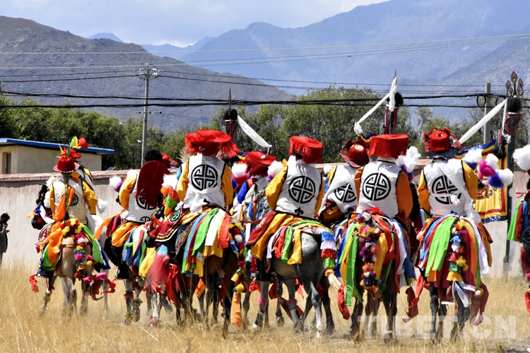 8月2日,西藏自治區(qū)拉薩市堆龍德慶區(qū)柳梧鄉(xiāng)桑達村迎來了一年一度的“望果節(jié)”,家家戶戶都起個大早,給家里的煨桑爐添上樹枝,撒上青稞面粉,再抹上幾點酥油,混合著松枝、酥油香味的桑煙便在村里彌漫開來。上午10時,村民們帶著青稞酒、煨桑用的柏枝,陸續(xù)走出家門來到村里的“拉康”(神殿)外,等待“望果節(jié)”儀式開始,大家歡聚在“拉康”(神殿)外有說有笑。噠噠馬蹄聲傳來,身著盛裝的騎手們把披紅掛綠的“戰(zhàn)馬”或牽或騎地帶到儀式現(xiàn)場?!?/p>