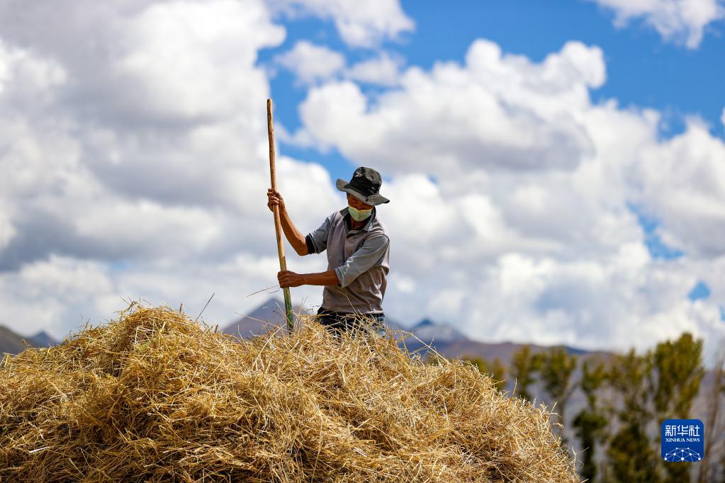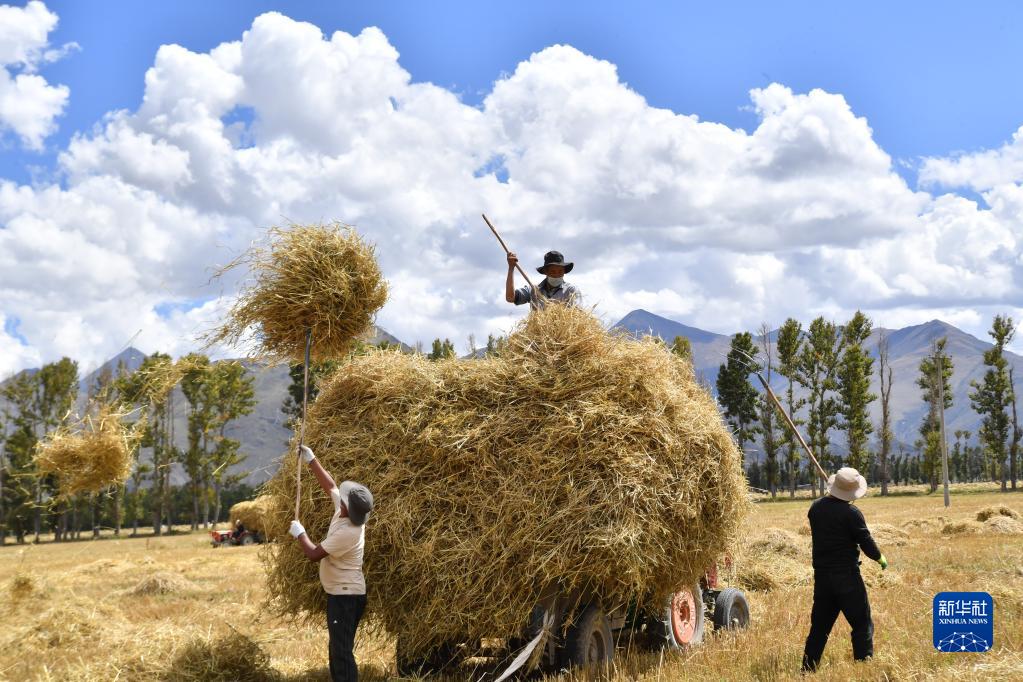 9月21日,拉薩市林周縣邊林鄉(xiāng)當(dāng)杰村的村民在收集秸稈。新華社記者 覺果 攝