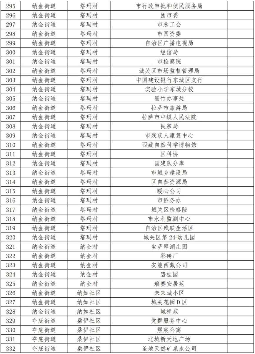 19.扎細(xì)街道團(tuán)結(jié)新村社區(qū)(拉薩市第三小學(xué)、拉薩市規(guī)劃設(shè)計(jì)院、自治區(qū)國資委、自治區(qū)藏醫(yī)院、自治區(qū)疾控中心、阜康醫(yī)院住院部、納木措賓館);