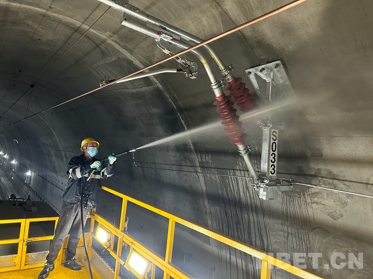 中國西藏網(wǎng)訊 初冬時節(jié),雅魯藏布江畔,秋葉繽紛、層林盡染。在穿山過江的拉林鐵路桑珠嶺隧道內(nèi)機(jī)器轟鳴、人聲鼎沸。11月14日10時25分,中國鐵路青藏集團(tuán)有限公司拉薩基礎(chǔ)設(shè)施段桑日綜合維修車間的接觸網(wǎng)工陳世召頭戴安全帽、身穿防雨服、腳踩絕緣靴,手中的高壓水槍迸射出道道白色弧線。