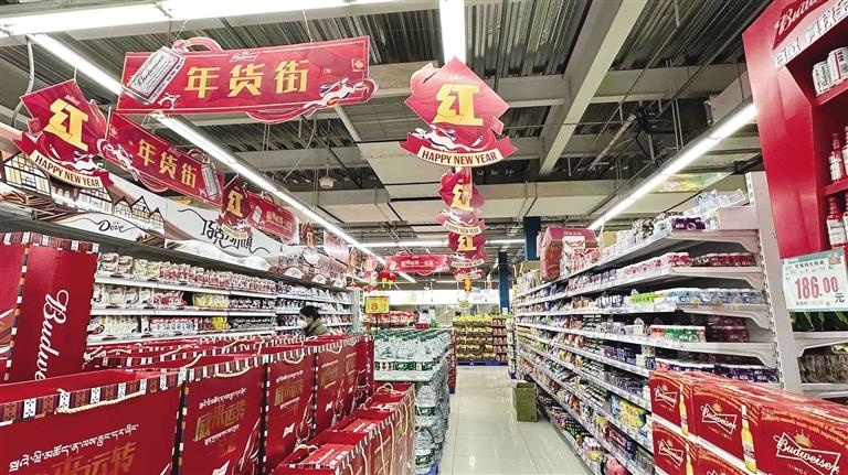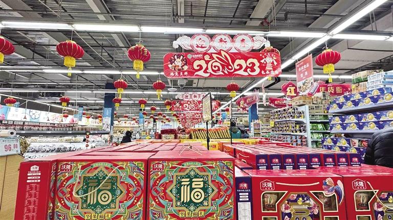 新年到,購(gòu)買(mǎi)年貨不可少。走進(jìn)大麥超市,寫(xiě)有“新年快樂(lè)”字樣的標(biāo)語(yǔ)牌隨處可見(jiàn),一副副寓意吉祥的對(duì)聯(lián)、各式各樣的“福”字、燈籠等新年裝飾,把春節(jié)的氣氛烘托得喜慶十足。貨架上,新鮮蔬菜、米面糧油、糖果點(diǎn)心、酒水飲料等熱銷(xiāo)年貨種類(lèi)繁多、一應(yīng)俱全,人們喜氣洋洋地穿梭在貨架旁,精心挑選著心儀的物品。市民張女士正在挑選對(duì)聯(lián),她告訴記者:“今年我們?nèi)叶荚诶_過(guò)年,想把家里好好裝飾一下,讓過(guò)年的氛圍更濃一些。新年要有新氣象,我希望家人平平安安、健健康康?!?/p>