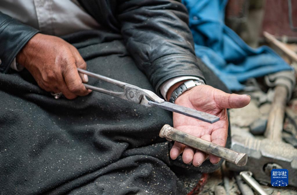在拉孜縣柳鄉(xiāng)孜龍村,次旦旺加在制作藏刀(3月10日攝)。新華社記者 孫非 攝