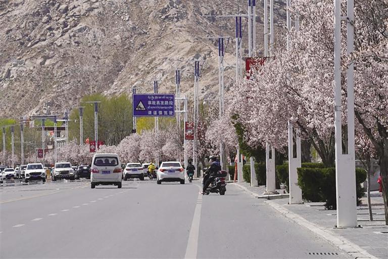 那么,去哪里查收這份“春日限定大禮包”呢?最近幾天,記者的朋友圈都被帕崩崗的美景霸屏了,一波又一波的朋友到這里打卡。除了去帕崩崗賞桃花,更不容錯過的一定是拉薩大街小巷以及公園中驚鴻一瞥的美景。宗角祿康公園植被繁茂、古樹較多,一到春季,玫粉色的榆葉梅綻放枝頭,層層花瓣在陽光的照耀下嬌俏動人,一樹粉色花朵倒映在幽綠的湖水中,盡顯詩意。此外,緊鄰羅布林卡的羅堆東路也有意想不到的美景,每到這個季節(jié),紅葉李便會沿路盛開,淡粉色的花瓣搭配深紅色的花蕊,甚是好看。金珠西路沿途的景色也令人耳目一新,淡粉色的花朵肆意綻放,等紅燈時的心情因這些花朵變得不再焦灼。