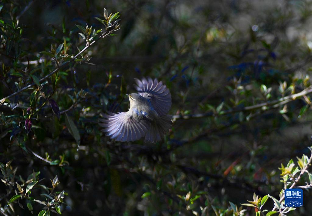 一只柳鶯在樹枝間飛行(4月24日攝)。新華社記者 張汝鋒 攝