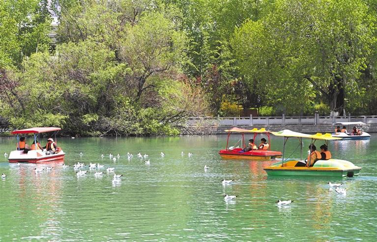 立夏時節(jié),拉薩處處綠樹成蔭、鳥語花香。宗角祿康公園樹木郁郁蔥蔥、湖水清澈見底,成為市民和游客游玩、休閑的好去處。 圖為市民和游客在宗角祿康公園乘船游玩。記者 洛桑 攝