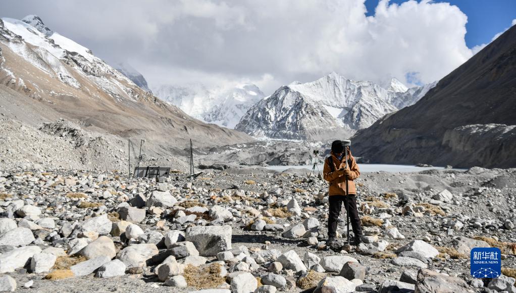在珠峰登山大本營附近,科考隊(duì)員對冰川進(jìn)行實(shí)時差分GPS定位(5月15日攝)。新華社記者 晉美多吉 攝