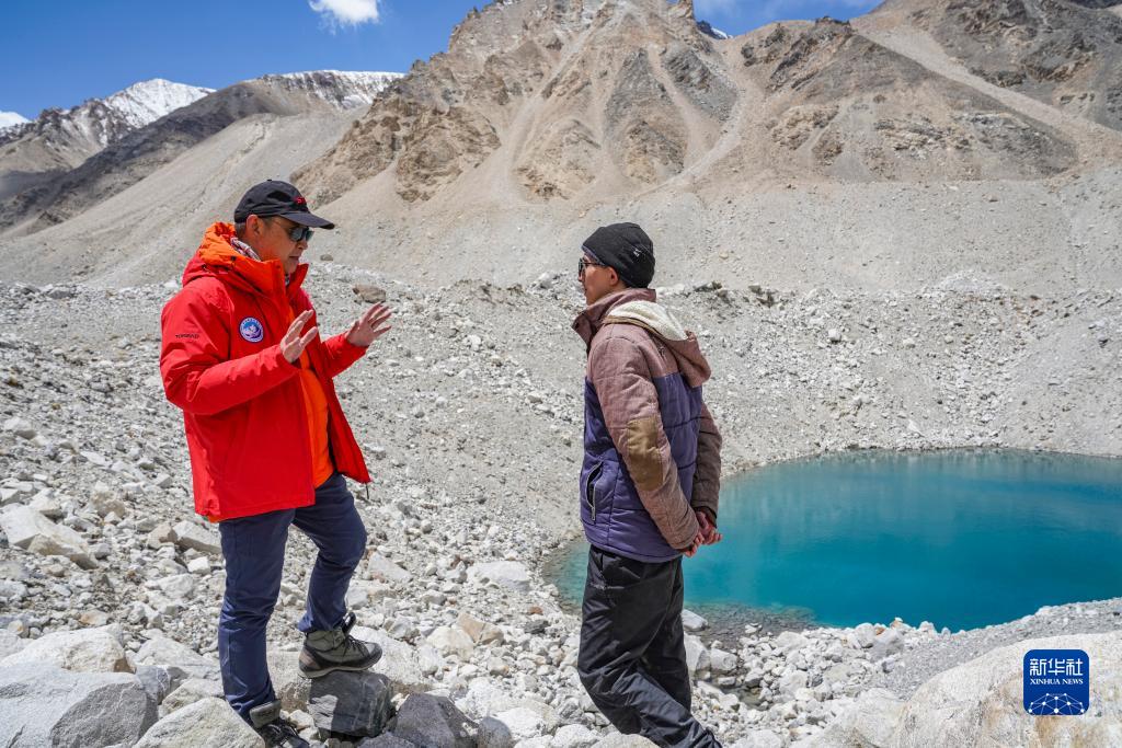 在珠峰海拔約5300米處,科考隊(duì)員在探討冰面湖的形成原因(5月14日攝)。新華社記者 孫非 攝