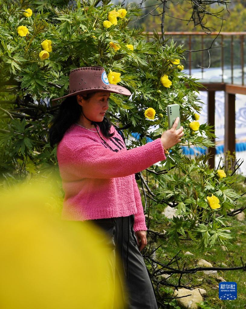 5月28日,一名游客在米林市南伊珞巴民族鄉(xiāng)扎貢溝野生大花黃牡丹前自拍。新華社記者 張汝鋒 攝