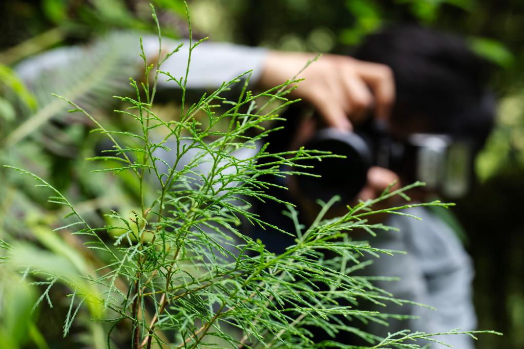 6月15日,中國(guó)科學(xué)院植物研究所博士研究生王孜在亞洲第一高樹(shù)旁拍攝一株西藏柏木的小樹(shù)苗。