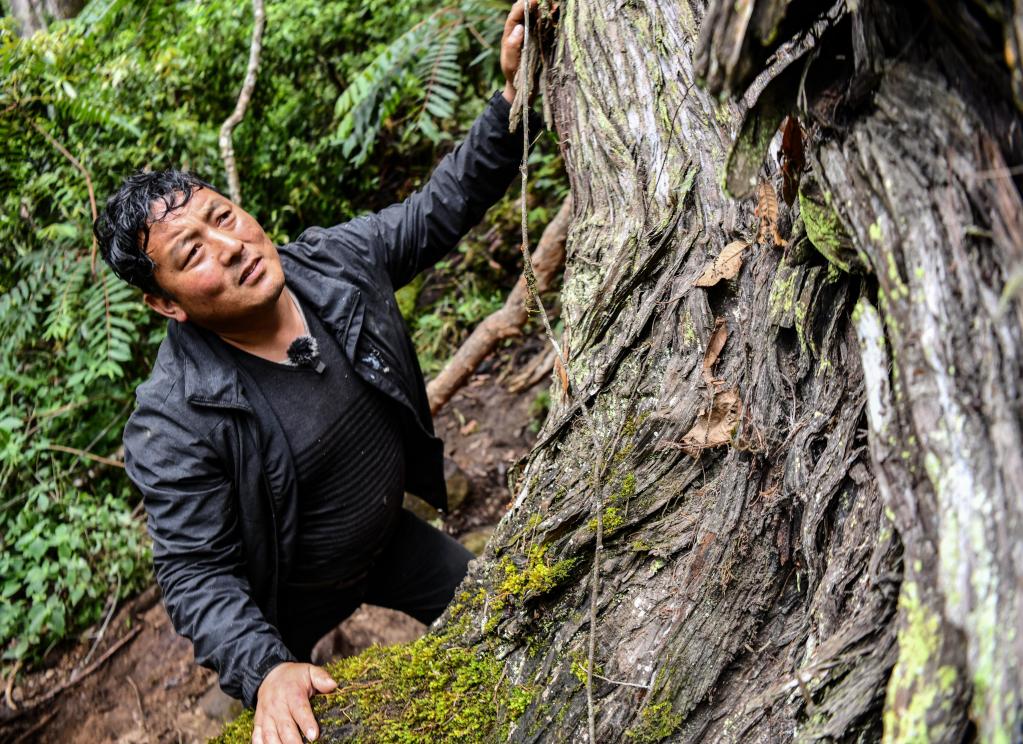 索朗次仁在查看家鄉(xiāng)的西藏柏木,今年5月,就是在他的帶領(lǐng)下,來(lái)自北大的科研人員發(fā)現(xiàn)了亞洲第一高樹(shù)(6月15日攝)。