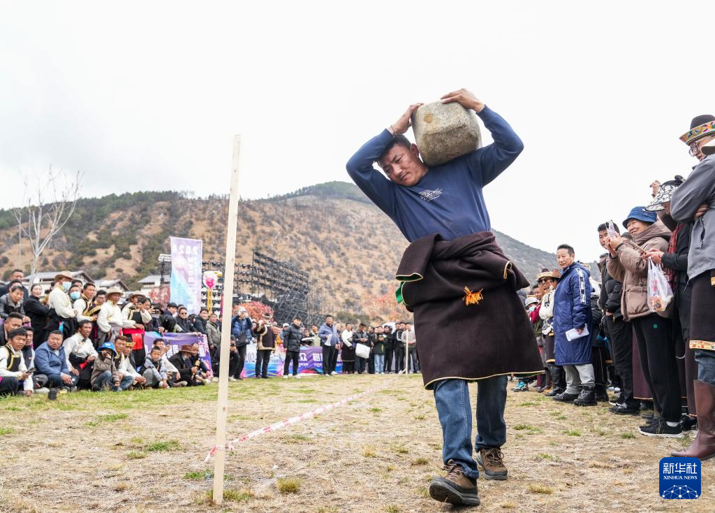 3月31日,在林芝市第二十一屆桃花旅游文化節(jié)民俗體育活動(dòng)中拍攝的抱石頭比賽。新華社記者 丁汀 攝