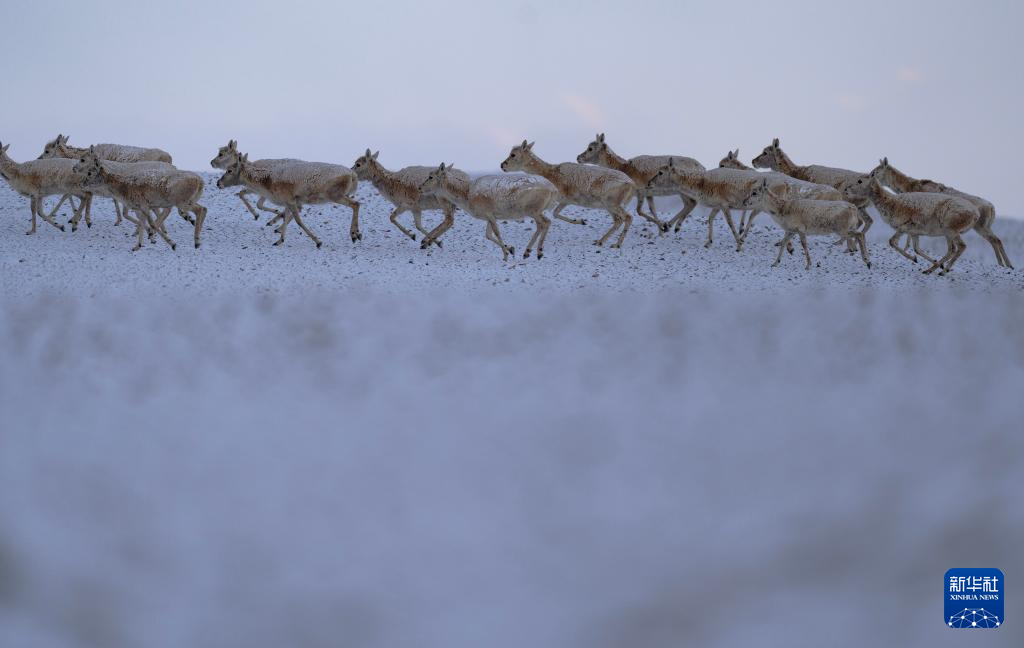 6月15日清晨雪后,在羌塘國(guó)家級(jí)自然保護(hù)區(qū),迎著朝霞前行在遷徙路上的一群藏羚羊。新華社記者 費(fèi)茂華 攝