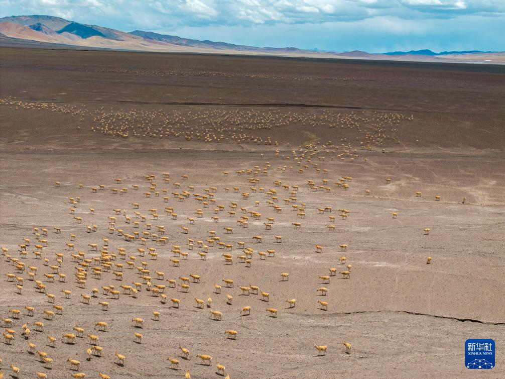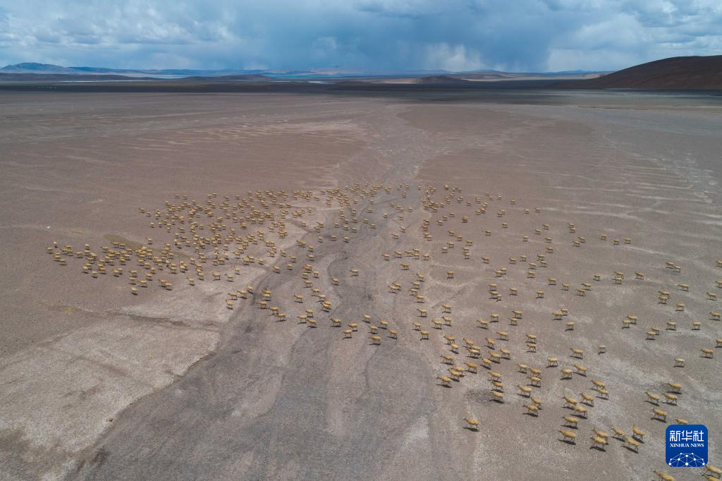 大群遷徙的藏羚羊在羌塘保護(hù)區(qū)核心區(qū)向產(chǎn)羔地遷徙(6月13日攝,無(wú)人機(jī)照片)。新華社記者 晉美多吉 攝