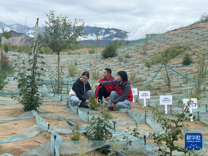 中國(guó)科學(xué)院成都山地災(zāi)害與環(huán)境研究所研究員周萍帶領(lǐng)研究生在西藏扎囊縣沙化土地生態(tài)治理綜合示范區(qū)開(kāi)展沙地試驗(yàn)樣方植被生長(zhǎng)狀況監(jiān)測(cè)。新華社記者 顧天成 攝