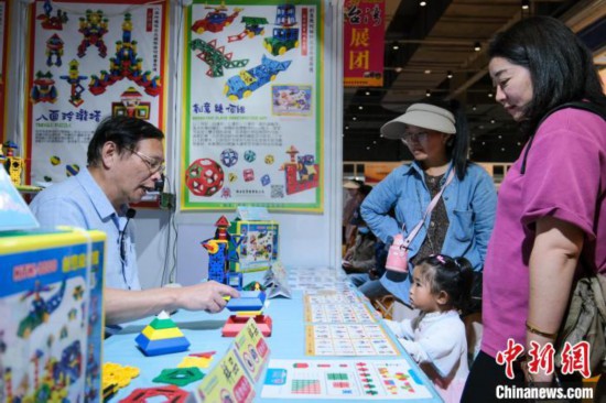 8月7日,臺灣博士兒實(shí)業(yè)有限公司總經(jīng)理葉國義(左)在展覽現(xiàn)場演示益智教具。中新社記者 江飛波 攝