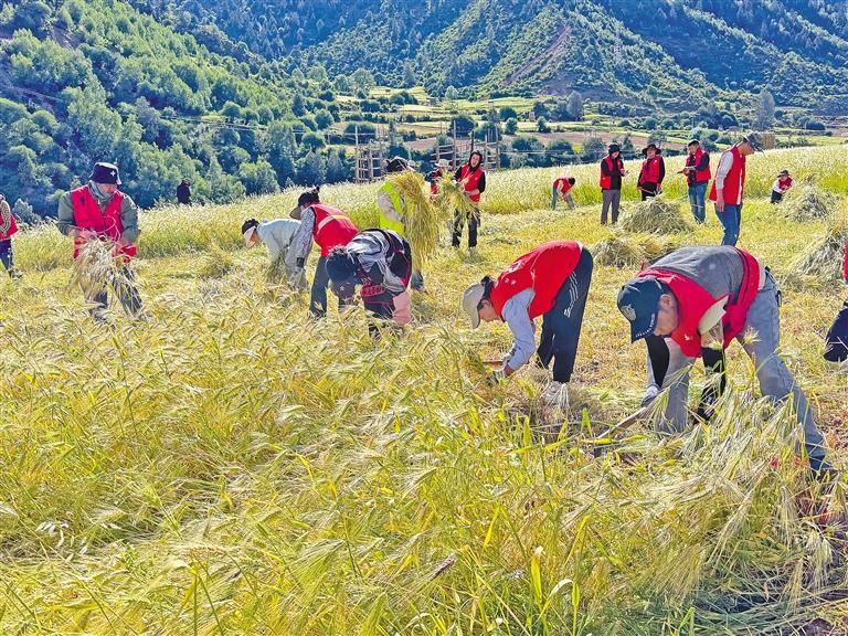圖為黨員干部與群眾一起收割青稞。卓瑪群錯 記者 平措郎加 攝