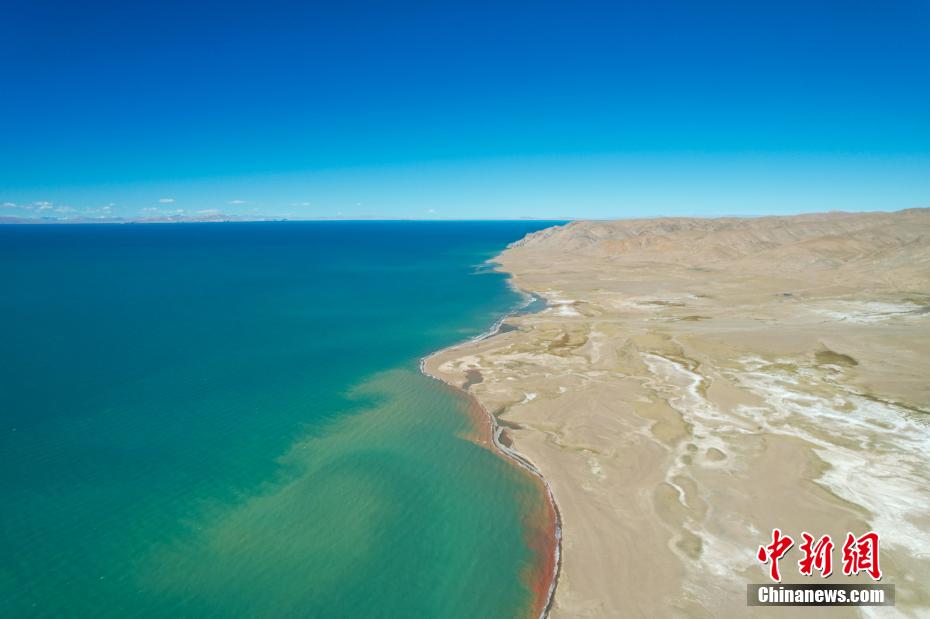 國慶期間,中新網(wǎng)記者自駕西藏藏北羌塘草原,途經(jīng)“天湖”納木錯,高原鹽湖班戈湖以及西藏第一大湖色林錯等地。秋天高原藍(lán)天白云的映襯下,藏北湖泊猶如一面面巨大的“寶石藍(lán)”鏡子鑲嵌于高原大地,景色壯麗。圖為10月4日,航拍西藏色林錯水天相接。記者 江飛波 攝