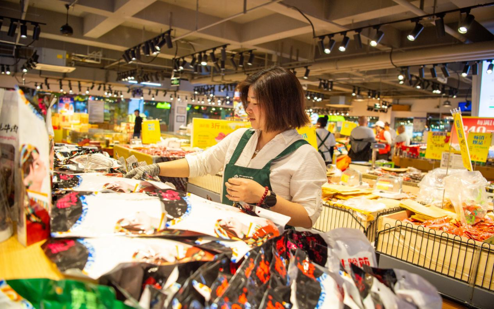 游客在西藏特產(chǎn)倉儲超市乃倉店試吃牛肉干。