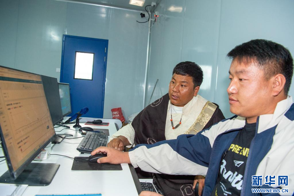 10月12日,西藏昌都市八宿縣物聯(lián)網(wǎng)植物工廠廠長江永澤仁(左)在監(jiān)看溫室前端控制臺。新華網(wǎng) 旦增努布 攝