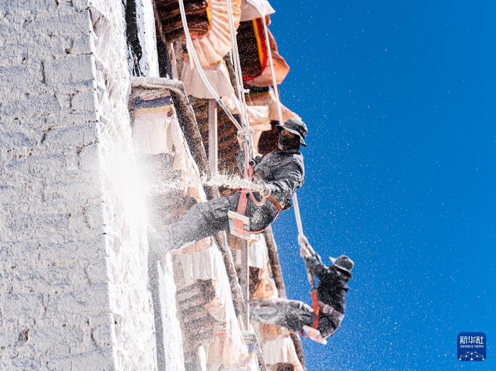 10月30日,布達拉宮管理處的工作人員在噴灑涂料。新華社記者 旦增尼瑪曲珠 攝 ??