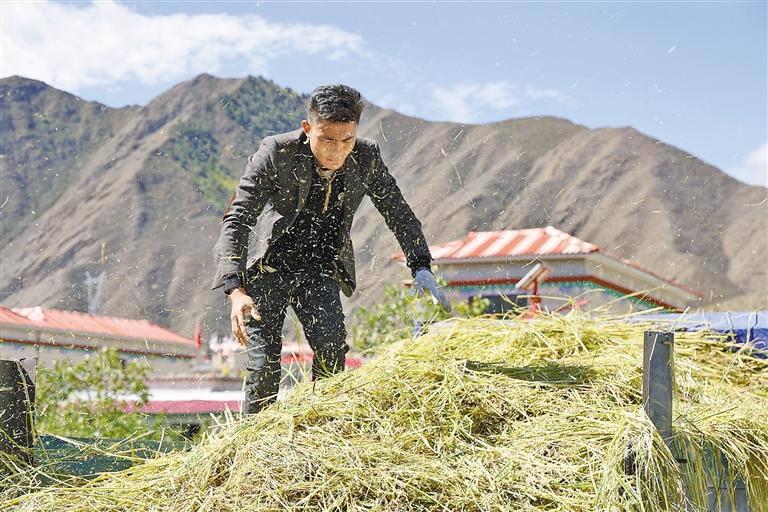 村民將收獲的水稻裝車。 記者 卓瑪七林 攝