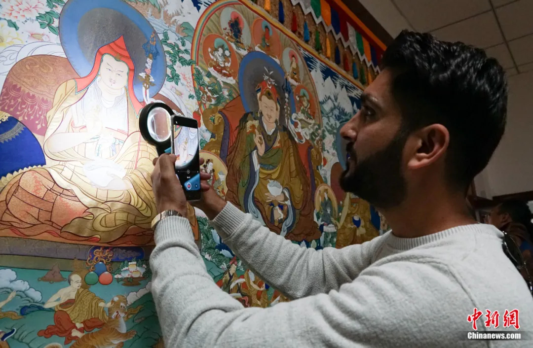 2023年9月13日,在青海省黃南藏族自治州同仁市熱貢畫院內(nèi),外國游客前來參觀。中新社記者 馬銘言 攝