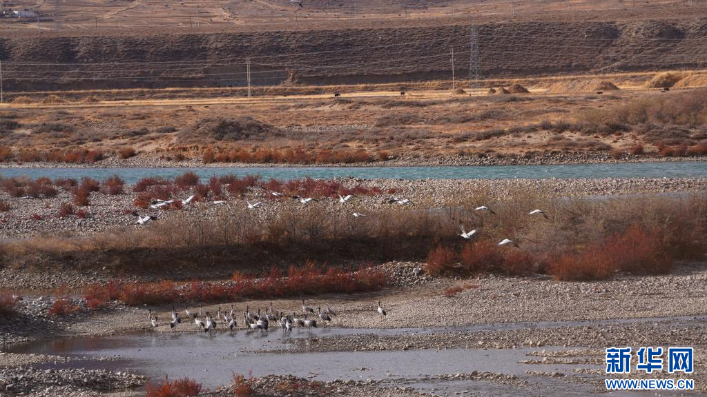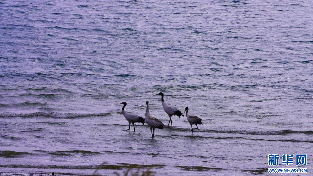 圖為岸邊的黑頸鶴(11月24日攝)。新華網發(fā) 嘎色攝 ??