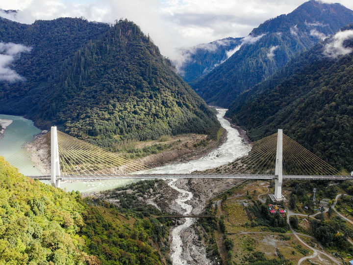 2019年10月27日拍攝的川藏公路通麥路段上的迫龍溝特大橋(無人機照片)。迫龍溝特大橋位于西藏林芝市波密縣境內(nèi),是西藏自治區(qū)內(nèi)最大的公路雙塔斜拉橋。新華社記者 孫非 攝