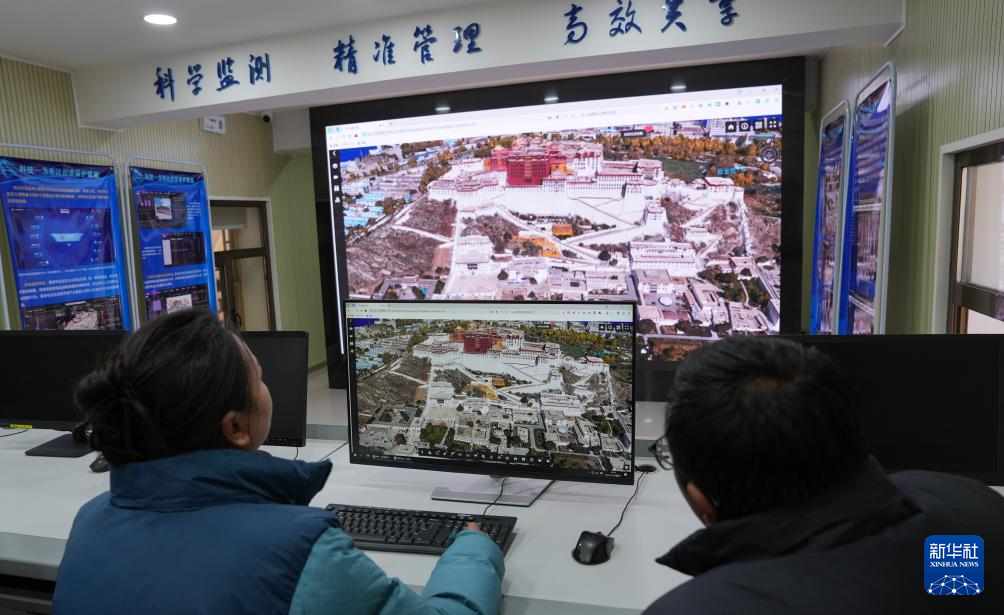 12月4日,布達(dá)拉宮監(jiān)測(cè)中心的工作人員在查看無(wú)人機(jī)拍攝的圖像。新華社記者 晉美多吉 攝