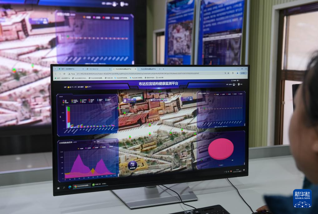 12月4日,布達(dá)拉宮監(jiān)測(cè)中心的工作人員在查看布達(dá)拉宮結(jié)構(gòu)健康監(jiān)測(cè)平臺(tái)。新華社記者 晉美多吉 攝