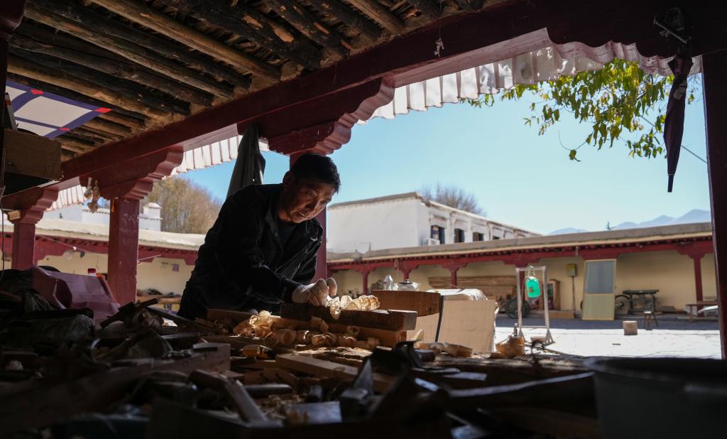 木匠普瓊正在制作布達(dá)拉宮修繕?biāo)枘緲?gòu)件。新華社記者 晉美多吉 攝