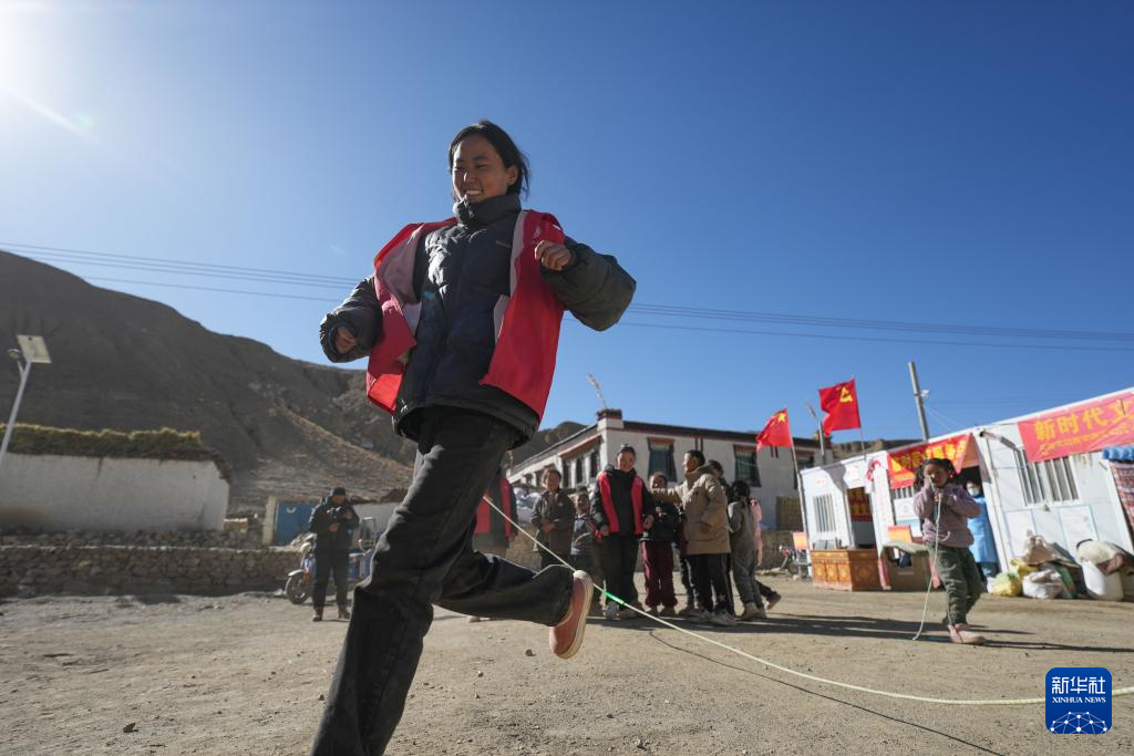 1月25日,在定日縣曲洛鄉(xiāng)熱木青村安置點(diǎn),大學(xué)生志愿者在安置點(diǎn)和孩子們一起玩游戲。新華社記者 晉美多吉 攝??