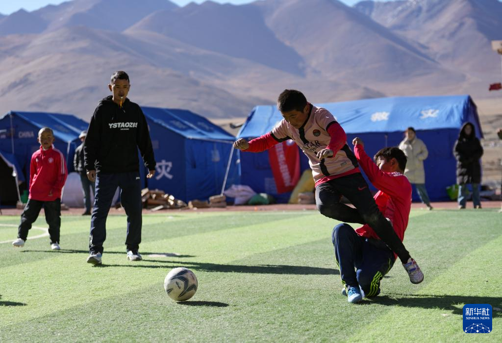 1月26日,在定日縣曲洛鄉(xiāng)完全小學(xué)操場(chǎng)上,長(zhǎng)所鄉(xiāng)嘎旦村和曲洛鄉(xiāng)措昂村的孩子們?cè)谶M(jìn)行足球比賽。新華社記者 晉美多吉 攝?