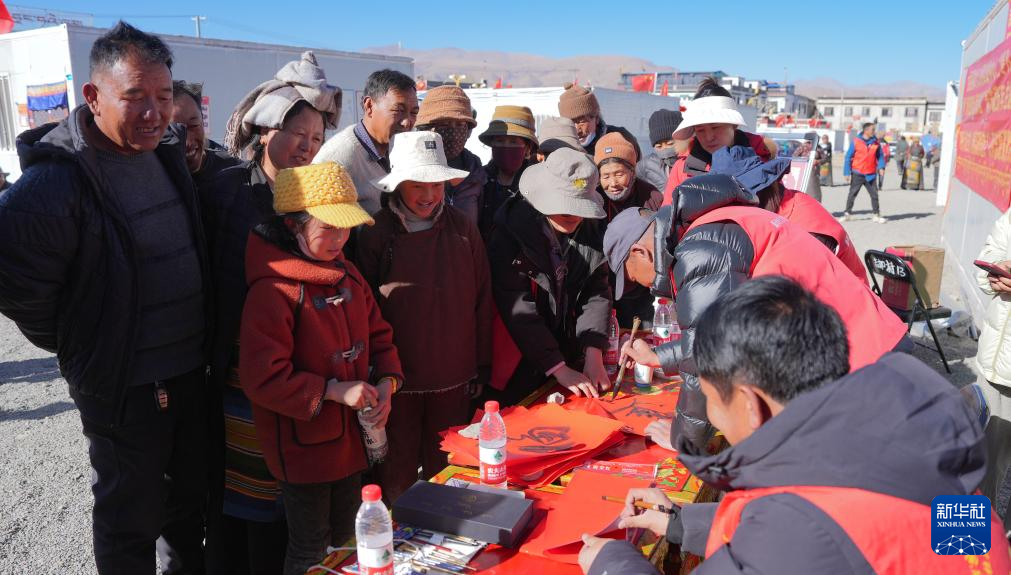 1月26日,書法家協(xié)會(huì)的志愿者在拉孜縣吉如村安置點(diǎn)為受災(zāi)群眾書寫春聯(lián)。新華社記者 晉美多吉 攝?