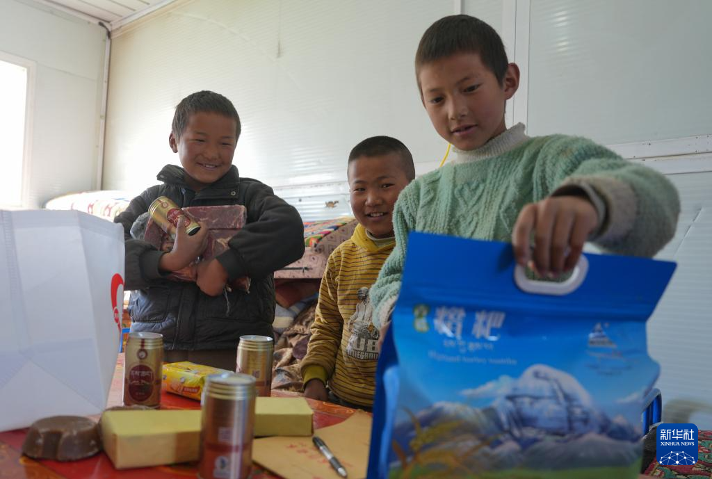 1月27日,拉孜縣加嘎村安置點(diǎn)受災(zāi)群眾領(lǐng)到新年大禮包。新華社記者 晉美多吉 攝