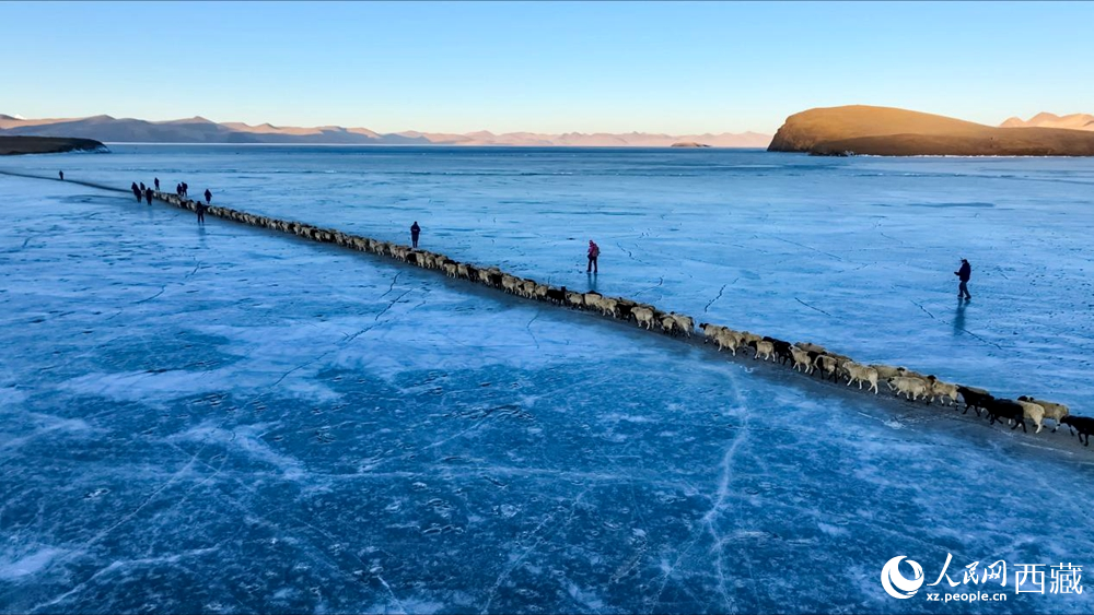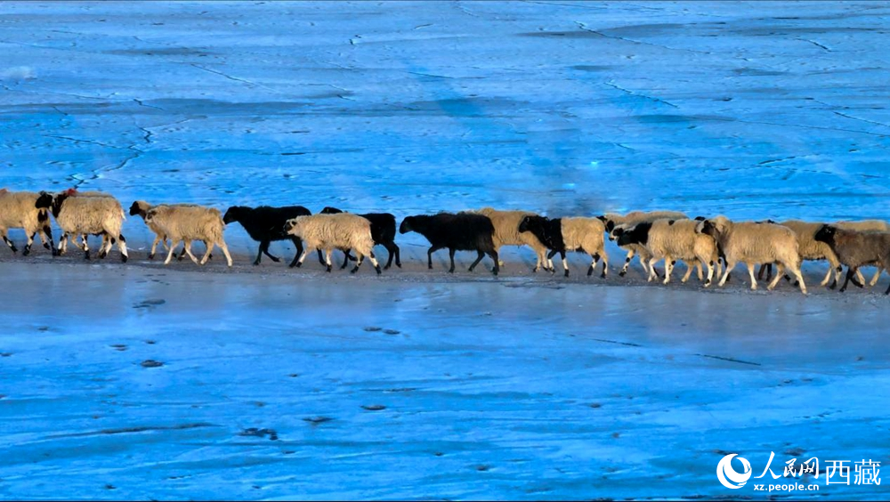 隨著一聲號令,牧民們驅(qū)趕著羊群,踏上冰封的湖面。遠遠望去,羊群如同一串串黑白相間的珍珠,在湛藍的冰面上緩緩移動,構(gòu)成一幅壯美的高原畫卷。