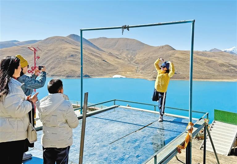 圖為游客在羊卓雍錯(cuò)拍照留念。記者 旦增蘭澤 攝