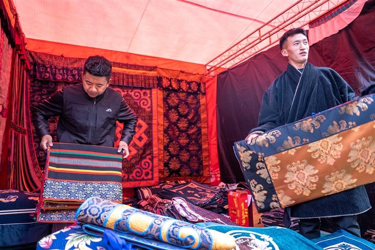據(jù)悉,此次堆龍德慶區(qū)的年貨節(jié)以“逛展位、享樂購、觀演藝、送政策、寫祝福”為五大核心亮點。參展商戶共有118戶,其中既有堆龍本土企業(yè)和合作社帶來的藏歷新年年貨、農(nóng)畜加工產(chǎn)品、民族手工藝品、傳統(tǒng)服飾,也有山南錯那市相關(guān)企業(yè)帶來的特色產(chǎn)品,品類總數(shù)達(dá)百余種。開幕當(dāng)日人流量達(dá)1000余人,銷售額10萬余元,呈現(xiàn)出購銷兩旺的熱鬧景象。攤主土旦羅布介紹:“這次我?guī)砹瞬貧v新年禮盒套裝,里面不僅包含了藏文對聯(lián)和吉祥八寶紅包,還有‘古突’里可包裹的12種代表不同寓意的簽文及寓意,很有過年的儀式感,非常受市民歡迎?!?/p>
