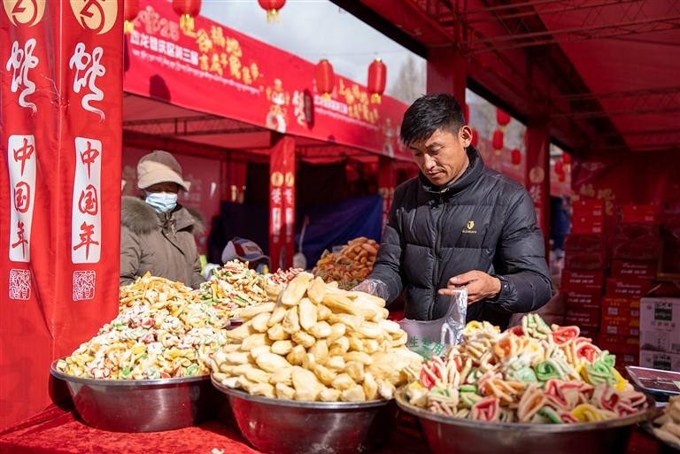 活動當(dāng)天,記者來到位于拉薩市城關(guān)區(qū)蔡公堂街道恩惠苑社區(qū)翰林苑小區(qū)附近的年貨市場,只見現(xiàn)場人聲鼎沸。150個攤位整齊排列,各類年貨商品琳瑯滿目,讓人目不暇接。這里有糖果、堅果、酥油、卡塞等傳統(tǒng)食品,有豬肉、牛肉干、羊肉等肉類制品,還有臘味熟食、奶渣餅等特色小吃,以及藏文對聯(lián)、喜慶裝飾、廚具餐具等日用百貨,完全能滿足居民群眾一站式的年貨購物需求。