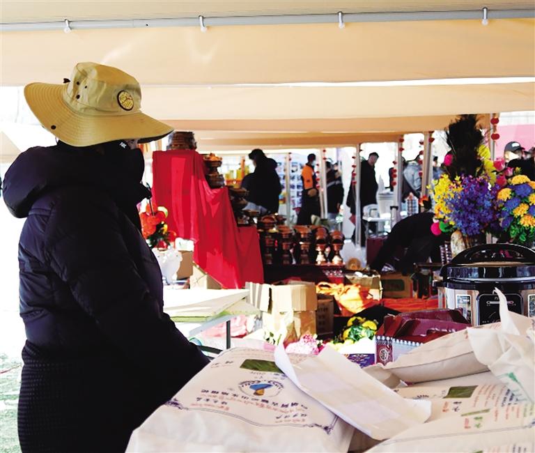 走進(jìn)體育場,首先映入眼簾的是巨型藏式切瑪五彩蛇形龍門架,其色彩絢麗、造型別致,承載著藏族人民對新年的美好祈愿。由五彩蛇形帳篷搭建的300個展位整齊排列,展位上擺滿了琳瑯滿目的商品。五彩麥穗在微風(fēng)中輕輕擺動,各類奶制品散發(fā)著誘人的奶香,還有各式各樣的藏式年貨、傳統(tǒng)手工藝品、農(nóng)副產(chǎn)品以及現(xiàn)代科技產(chǎn)品,令人目不暇接。