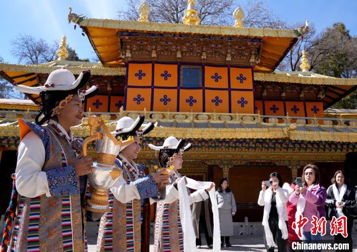 圖為歡迎儀式現(xiàn)場,工作人員向香港游客敬獻(xiàn)青稞酒。中新社記者 李林 攝