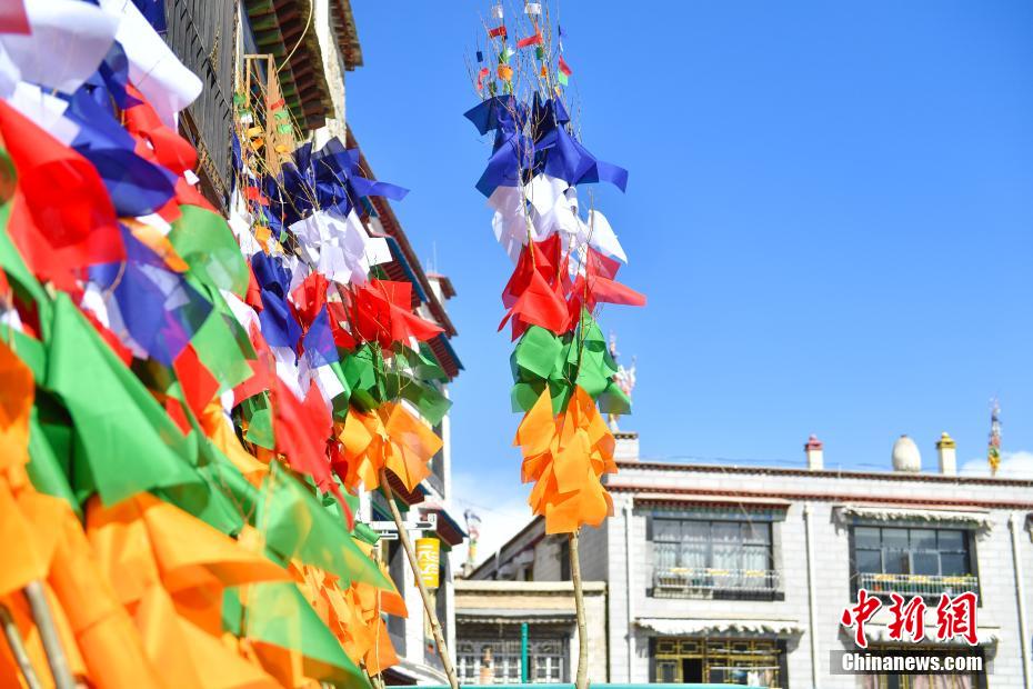 臨近藏歷新年,2月16日,在西藏拉薩街頭,農(nóng)牧民正縫制五彩經(jīng)幡樹。五彩經(jīng)幡樹是藏族民眾在藏歷新年前必備的年貨之一。藏歷新年期間,藏族民眾會選擇一個良辰吉日,為自家的房頂更換五彩經(jīng)幡樹,祈求新的一年里五谷豐登,吉祥如意。圖為2月16日,普瓊在給顧客展示五彩經(jīng)幡樹。貢確 攝