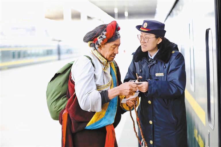 圖為列車工作人員為旅客提供乘車引導(dǎo)服務(wù)。記者 史金茹 攝