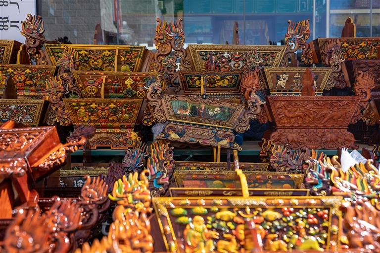 “老板,這個(gè)切瑪盒多少錢(qián)?便宜點(diǎn)我就拿走了?!薄斑@個(gè)圖案樣式都是精心雕刻的,最低1300元,實(shí)在不能再少了?!贝稳实牡赇伹?,不少顧客正在挑選“切瑪盒”,生意很是火爆?!扒鞋敽小笔菍⒕贫沸文竞杏酶舭宸珠_(kāi),左右兩邊分別盛入炒青稞和糌粑,再插上象征五谷豐登的“羅薩梅朵”和寓意吉祥的酥油花,寓意人壽年豐、吉祥如意,是藏歷新年家家戶(hù)戶(hù)必備的年貨之一。次仁告訴記者,“切瑪盒”根據(jù)圖案、顏料、大小、木材等因素,售價(jià)從幾百元到上千元不等,很多顧客普遍喜愛(ài)傳統(tǒng)樣式與圖案。