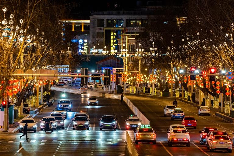 漫步在林廓東路北段、民族南路、北京中路……大街小巷都披上了藏歷新年的盛裝,新年元素琳瑯滿目,處處洋溢著節(jié)日的氣息。夜幕降臨,華燈初上,道路兩側(cè)樹上的燈籠和燈串開啟亮燈模式,街道在燈光的交相輝映下,傳遞出濃郁的年味,流光溢彩的街景也讓拉薩更顯活力,不時有人用手機定格此刻的畫面。