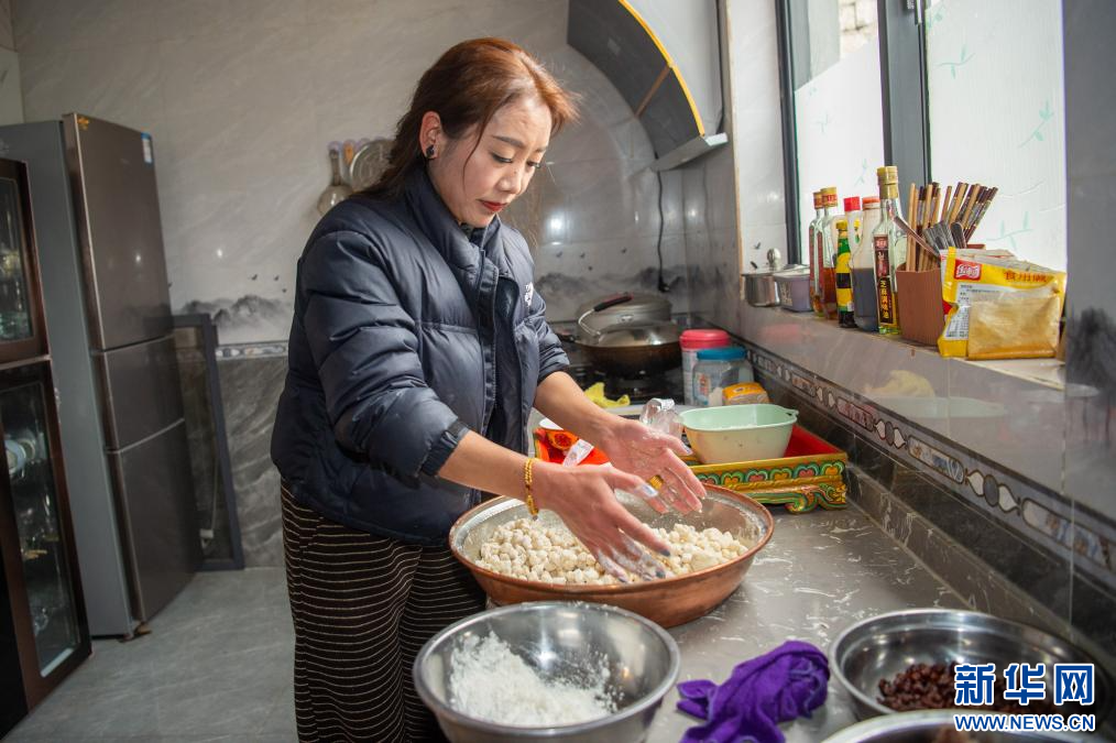2月27日,村民尼珍在扎西曲登社區(qū)29號(hào)民宿制作“古突”。新華網(wǎng) 旦增努布 攝