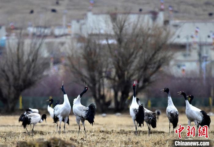 黑頸鶴是全球十五種鶴類中唯一在高原地區(qū)繁殖和越冬的鶴類,被譽為“高原神鳥”,屬中國國家一級保護動物。每年10月中下旬左右,黑頸鶴陸續(xù)飛抵雅魯藏布江中游河谷等地越冬。圖為3月8日,西藏拉薩林周縣黑頸鶴保護區(qū),黑頸鶴在田間覓食、嬉戲。中新社記者 李林 攝